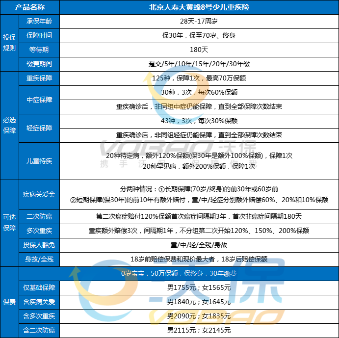 (2)大黄蜂7号:大黄蜂8号是大黄蜂7号的升级版,两款产品保障责任差不多,只不过升级后的大黄蜂8号是取消重疾住院津贴,疾病关爱金变为可选,且罕见疾病保障增加到了20种,价格上有一定变化,如果侧重于重疾住院津贴的家长,也可以直接选择大黄蜂7号,性价比很高,0岁男孩买50万,保障终身的话是1835元/年;保30年是618元,性价比同样很高;