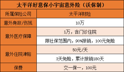 太平洋好意保小宇宙意外险有100元免赔额,在社保报销,扣除免赔额后可以报销社保内剩余费用的90%,住院津贴是50元一天。