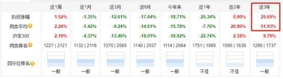我们换一个表来看更加清楚。最近三年东方红睿轩的收益率是25.65%,而市场上混合型基金的同类基金的平均收益率达到51.9%,连同类平均收益率的一半都没达到。