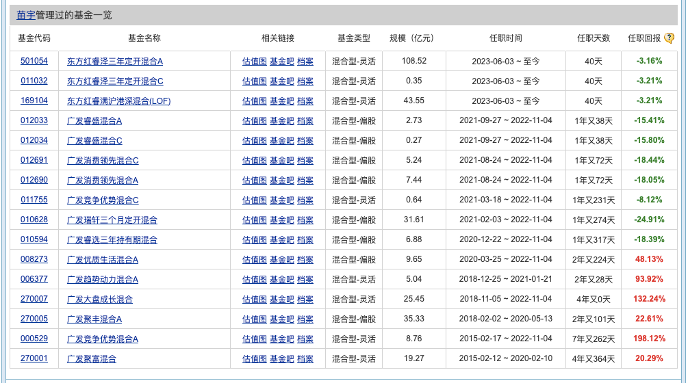 比如接任孙伟成为东方红睿满基金经理的苗宇,此前在广发基金任职,截至目前基金投资年限7.8年,年化回报率9.56%。苗宇管理的基金中业绩表现好的主要集中在2020年前接手管理的基金,2020年末以来接管的基金都未能获得正收益率。