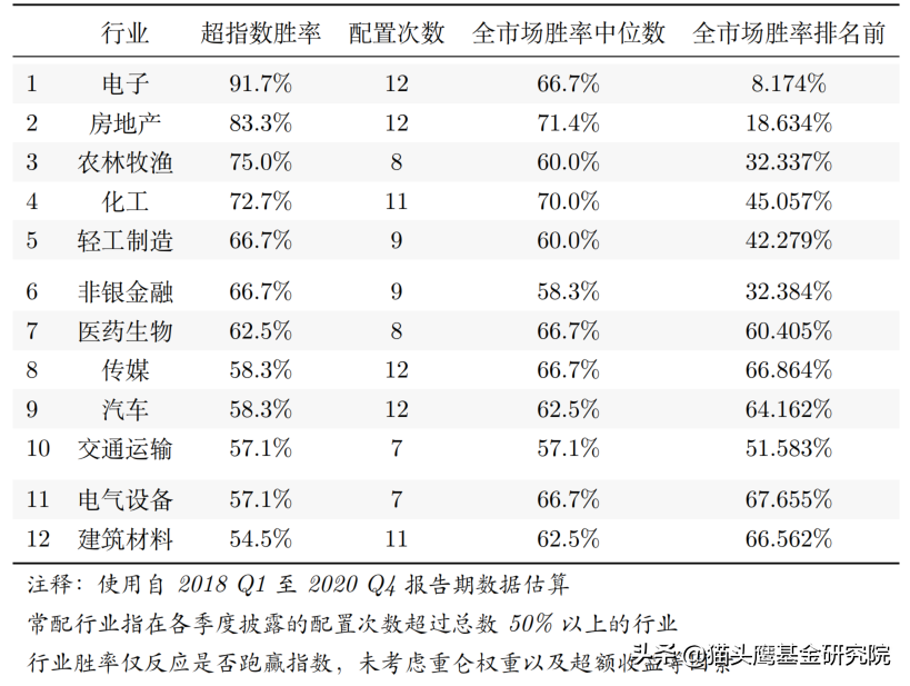 具体来看,首先他有着较好的能力宽度,在如下12个常配的行业[iv]中,胜率[v]都能达到50%以上。