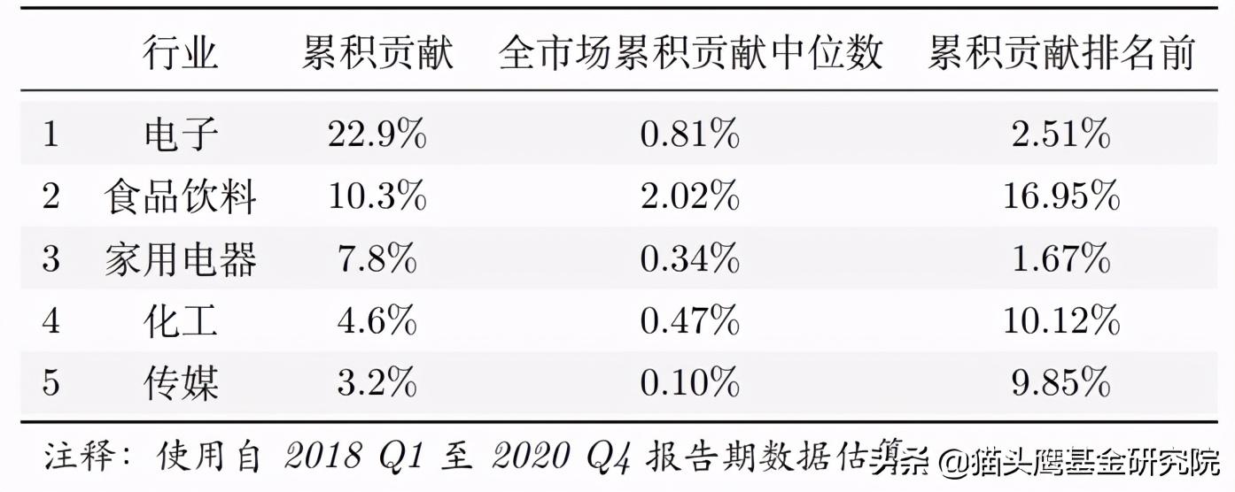 [vi]累计贡献指的是此行业为组合带来的累计收益贡献大小。即由每个季度公告的持仓数据加总计算,每个季度持仓的收益率*相应的配置权重。