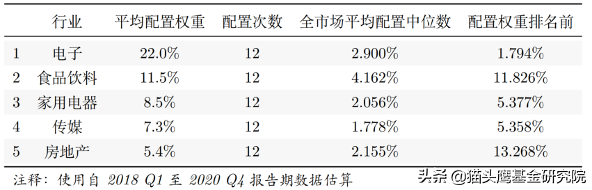 表2 平均配置权重5% 以上的行业汇总