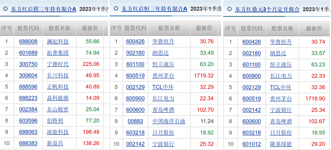 我们观察基金的持仓发现,以2023年一季度为例,东方红启程三年持有与其他2只基金的持仓大不相同,该基金以新能源、半导体等科技股为主,其他2只基金持仓持仓比较分散偏均衡。