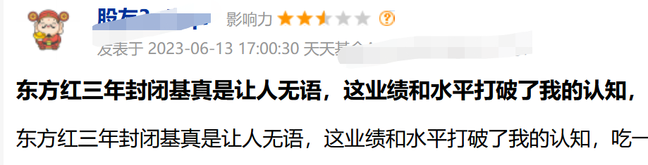 在转型公募产品后,基金产品业绩表现不佳,遭到了基民的吐槽。在基金社区,有基民表示,“当初买的时候,期盼赚钱,去年盼到期能保本,现在看来,还是太天真了”,还有基民表示,“东方红三年封闭基金真是让人无语,这业绩和水平打破了我的认知。”