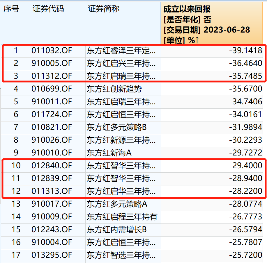 Wind数据显示,截至2023年6月28日,东方红资管旗下的多只“三年期持有”基金成立以来业绩表现较差,净值跌幅超过25%,甚至有跌幅达39%的。
