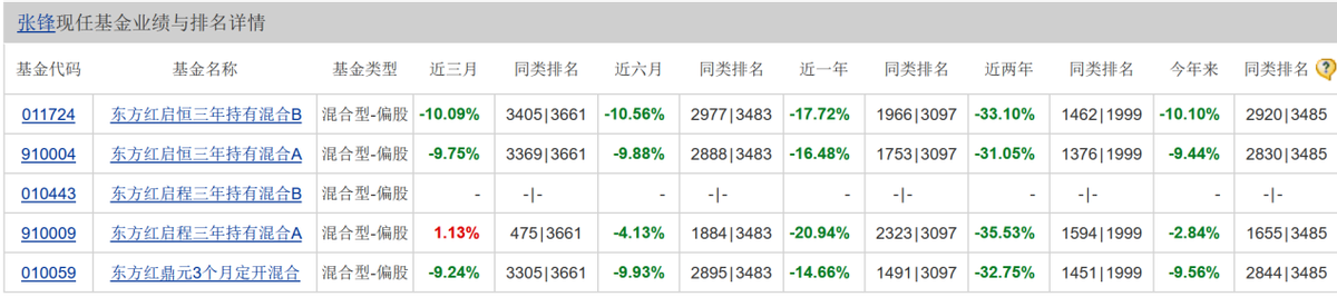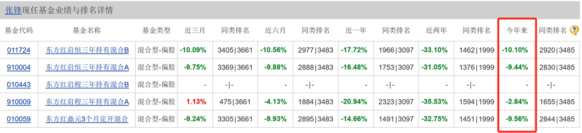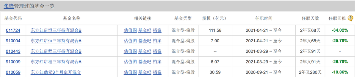 我们观察发现,在业绩表现较差的基金产品中,竟然有几只产品是东方红资管现任总经理张锋亲自管理的。
