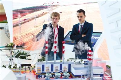昨日,在俄罗斯符拉迪沃斯托克,工作人员在沙盘模型前交谈。新华社记者 白雪骐 摄