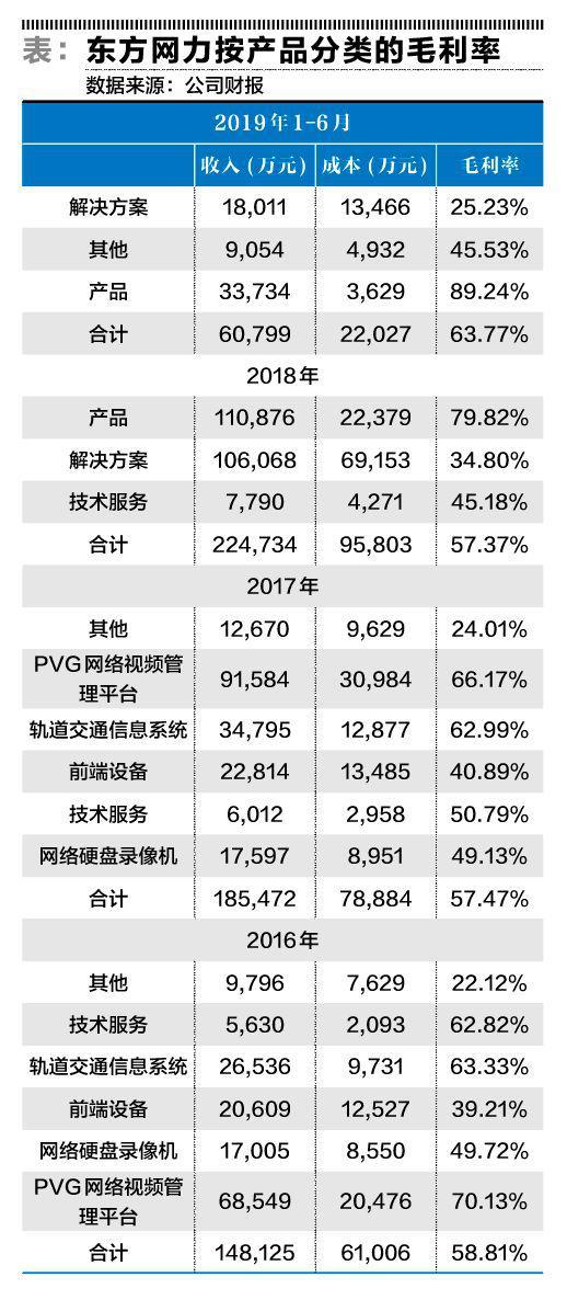 从毛利率来看,东方网力碾压行业龙头。上半年,东方网力综合毛利率为63.77%,而海康威视为46.33%、大华股份为40.37%。时间回放拉长至2014年,2014年至2018年,东方网力的毛利率分别为53.84%、56.29%、58.81%、57.47%、57.37%,海康威视分别为44.42%、40.10%、41.58%、44.00%、44.85%,大华股份为38.14%、37.22%、37.71%、38.23%、37.16%。从过去五年来看,东方网力的毛利率一直远超海康威视和大华股份。而东方网力的营收规模约为大华股份的十分之一,为海康威视的二十分之一,为何其毛利率反而遥遥领先?东方网力上市前的毛利率比海康威视高几个百分点,上市后,东方网力反而越战越勇,毛利率越来越高,而海康威视的毛利率却在下滑,两者的毛利率差距继续拉大。东方网力销售的产品中,毛利率最高的产品在2019年上半年达到89.24%,2018年也高达79.82%,最暴利的产品占营收的比例约五成。过去三年,海康威视毛利率最高的产品为55.57%,大华股份为44.11%。东方网力到底有什么产品可以如此暴利?