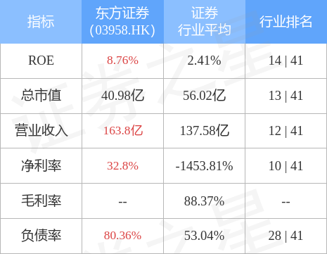 东方证券市值40.98亿元,在证券行业中排名第13。主要指标见下表: