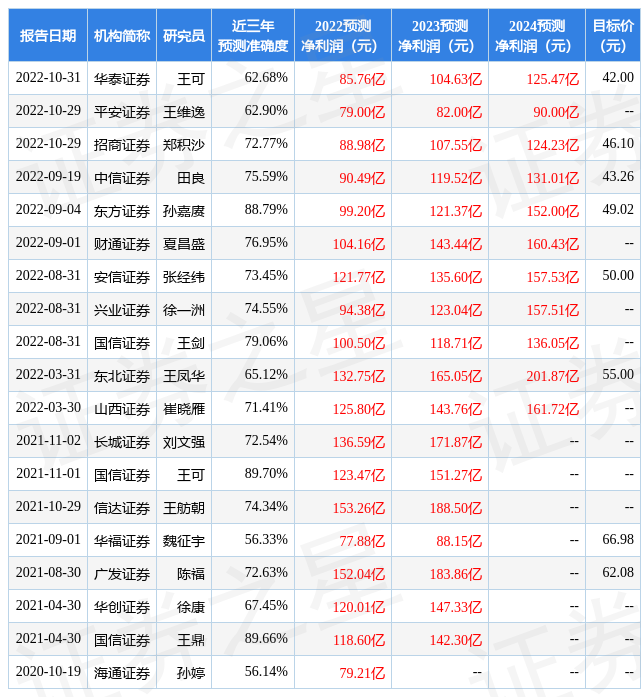 证券之星数据中心根据近三年发布的研报数据计算,国信证券王可研究员团队对该股研究较为深入,近三年预测准确度均值高达89.7%,其预测2022年度归属净利润为盈利123.47亿,根据现价换算的预测PE为13.53。