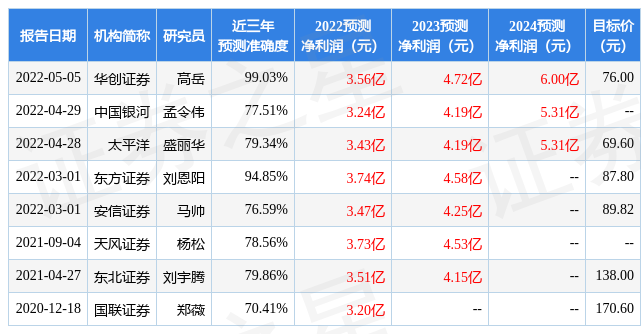 证券之星数据中心根据近三年发布的研报数据计算,华创证券高岳研究员团队对该股研究较为深入,近三年预测准确度均值高达99.03%,其预测2022年度归属净利润为盈利3.56亿,根据现价换算的预测PE为9.03。