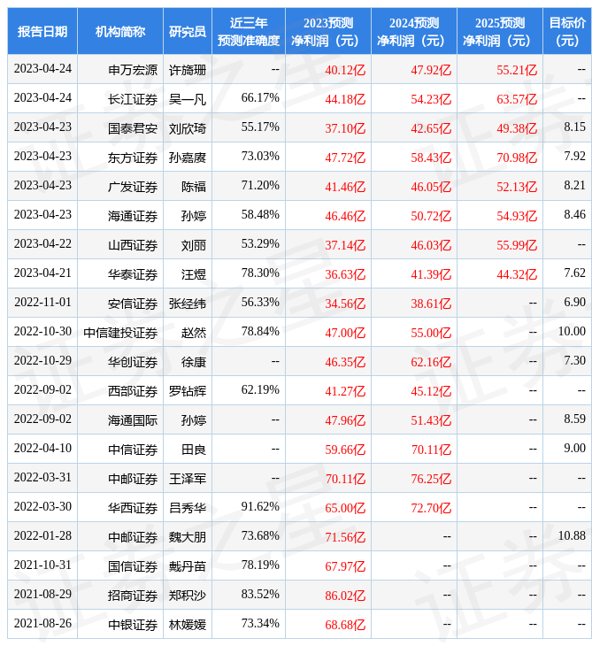 证券之星数据中心根据近三年发布的研报数据计算,华西证券吕秀华研究员团队对该股研究较为深入,近三年预测准确度均值高达91.62%,其预测2023年度归属净利润为盈利65亿,根据现价换算的预测PE为6.88。