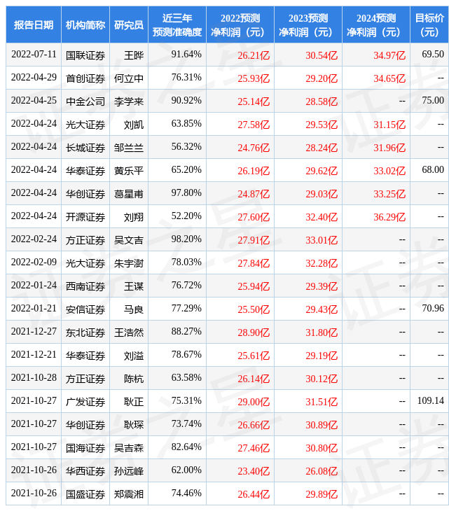 证券之星数据中心根据近三年发布的研报数据计算,方正证券吴文吉研究员团队对该股研究较为深入,近三年预测准确度均值高达98.2%,其预测2022年度归属净利润为盈利27.91亿,根据现价换算的预测PE为26.8。