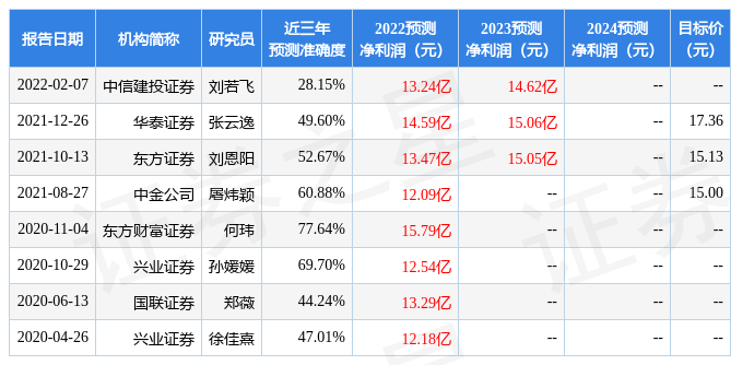 证券之星数据中心根据近三年发布的研报数据计算,东方财富证券何玮研究员团队对该股研究较为深入,近三年预测准确度均值为77.64%,其预测2022年度归属净利润为盈利15.79亿,根据现价换算的预测PE为14.37。