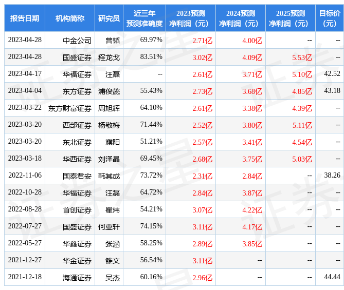 证券之星数据中心根据近三年发布的研报数据计算,国盛证券程龙戈研究员团队对该股研究较为深入,近三年预测准确度均值高达83.51%,其预测2023年度归属净利润为盈利3.02亿,根据现价换算的预测PE为23.81。