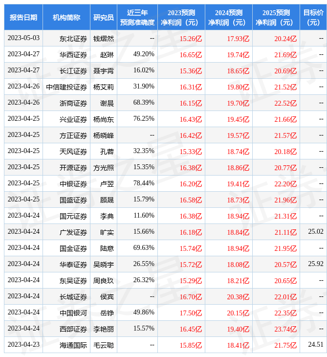 证券之星数据中心根据近三年发布的研报数据计算,中银证券卢翌研究员团队对该股研究较为深入,近三年预测准确度均值为78.44%,其预测2023年度归属净利润为盈利16.2亿,根据现价换算的预测PE为23.12。