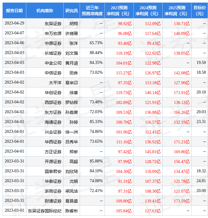 证券之星数据中心根据近三年发布的研报数据计算,长城证券刘文强研究员团队对该股研究较为深入,近三年预测准确度均值高达88.44%,其预测2023年度归属净利润为盈利110.19亿,根据现价换算的预测PE为10.58。