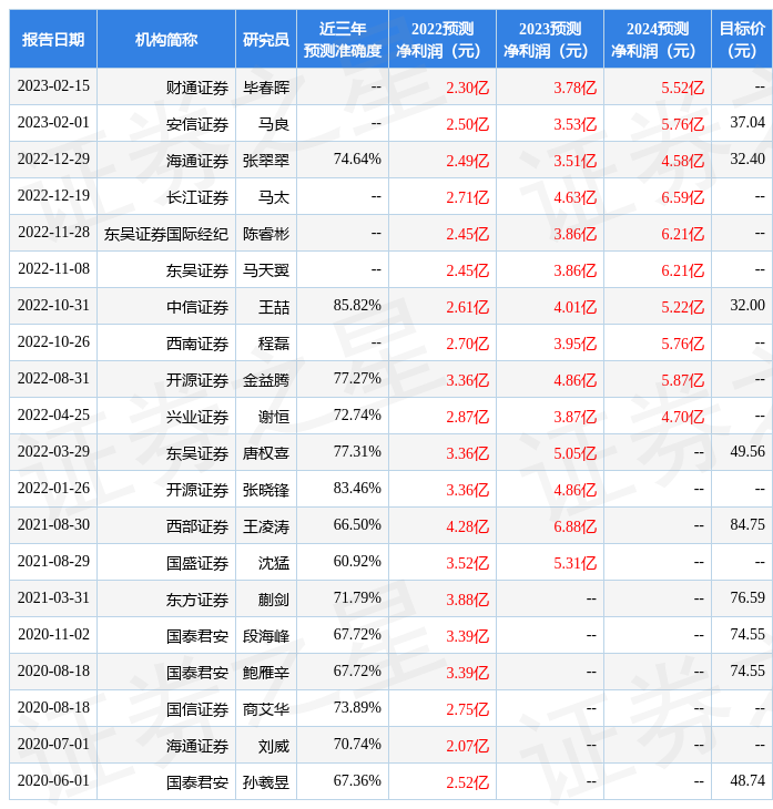 证券之星数据中心根据近三年发布的研报数据计算,中信证券王喆研究员团队对该股研究较为深入,近三年预测准确度均值高达85.82%,其预测2022年度归属净利润为盈利2.61亿,根据现价换算的预测PE为33.9。