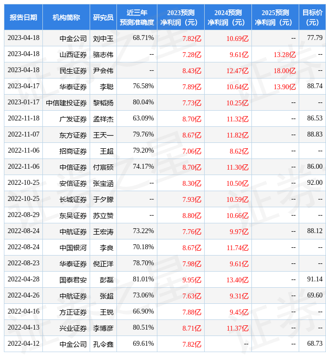 证券之星数据中心根据近三年发布的研报数据计算,国泰君安彭磊研究员团队对该股研究较为深入,近三年预测准确度均值高达81.01%,其预测2023年度归属净利润为盈利9.95亿,根据现价换算的预测PE为28.51。