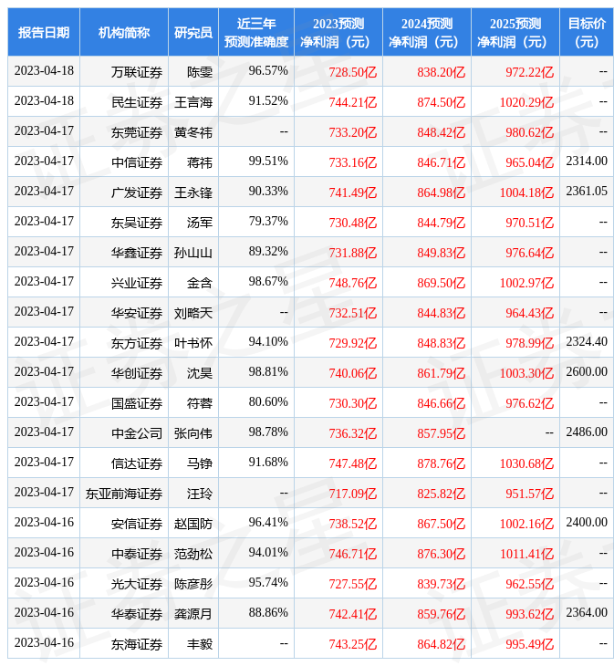 证券之星数据中心根据近三年发布的研报数据计算,中信证券蒋祎研究员团队对该股研究较为深入,近三年预测准确度均值高达99.51%,其预测2023年度归属净利润为盈利733.16亿,根据现价换算的预测PE为29.88。