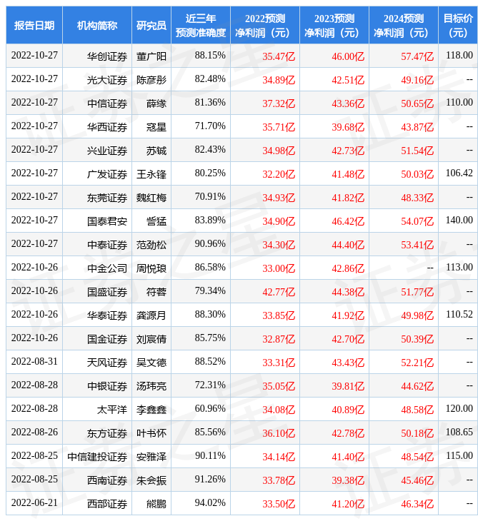 证券之星数据中心根据近三年发布的研报数据计算,西部证券熊鹏研究员团队对该股研究较为深入,近三年预测准确度均值高达94.02%,其预测2022年度归属净利润为盈利33.5亿,根据现价换算的预测PE为34.31。