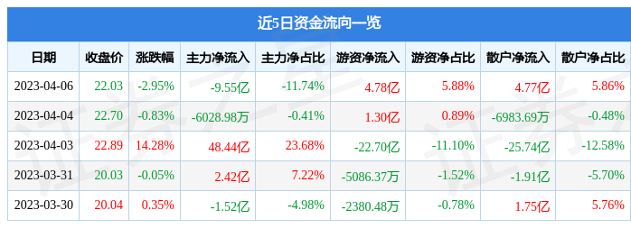 4月6日的资金流向数据方面,主力资金净流出9.55亿元,占总成交额11.74%,游资资金净流入4.78亿元,占总成交额5.88%,散户资金净流入4.77亿元,占总成交额5.86%。