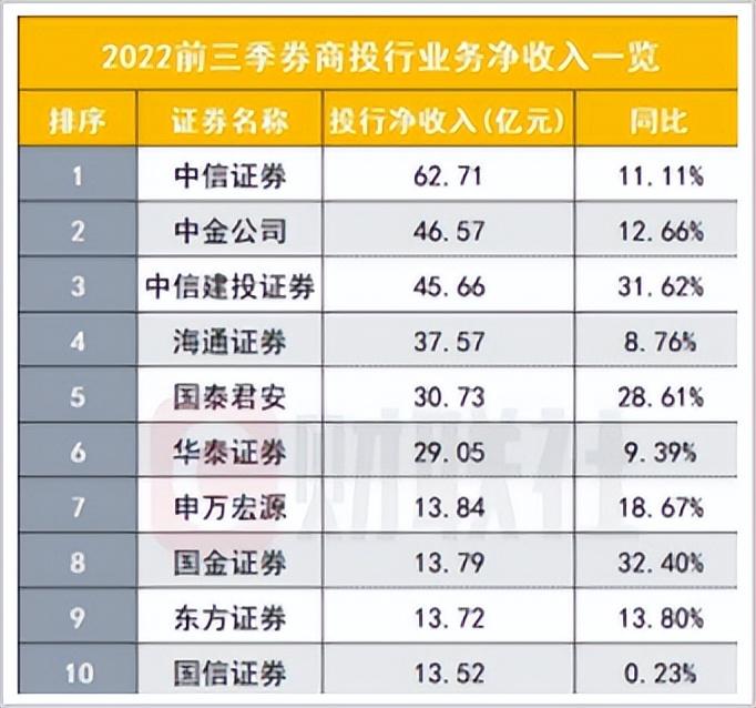 过去一年的券业寒冬中,有一项业务板块仍出现较强发展韧性,即服务于B端用户上市融资需求的投行业务。2022年前三季度,41家可比数据券商实现投行业务净收入总计为429.98亿元,同比逆势增长了5.35%。