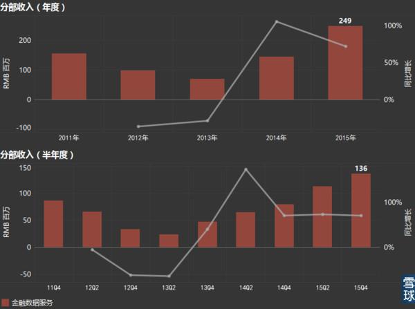 金融数据服务是东方财富另一块发展迅速的领域。2015年,金融数据服务收入2.5亿,占比达到8.5%,同比增长72.1%。