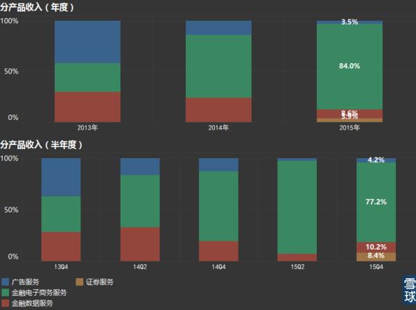 仅有去年年度的数据(一季度不公布分部数据),收入分成四部分:广告服务、金融电子商务服务、金融数据服务和证券服务(12月完成同信证券的合并)。