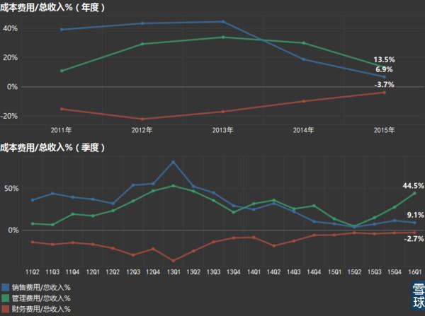 进一步分析,变化最为明显的就是管理费用。2016年一季度,管理费用达到2.7亿,吃掉了44.5%的收入,较上年同期增加406.94%。主要原因:人员规模较上年同期有较大幅度增长,相应的职工薪酬及研发费用等同比增加。