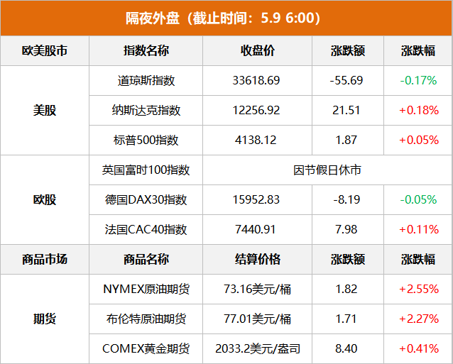 标普500指数收涨1.87点,涨幅0.05%,报4138.12点。道指收跌55.69点,跌幅0.17%,报33618.69点。纳指收涨21.50点,涨幅0.18%,报12256.92点。