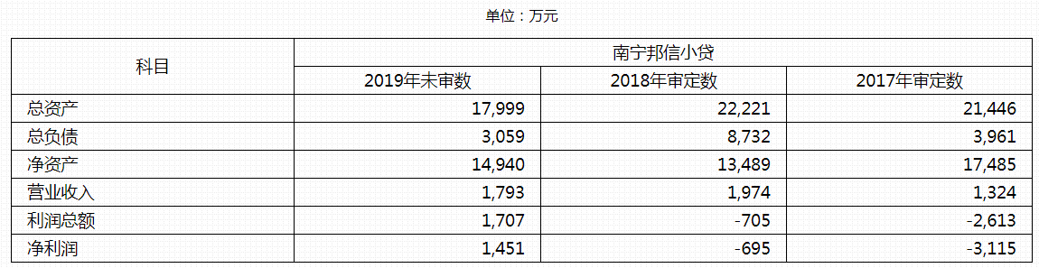 截止2019年末,南宁邦信小贷总资产为1.80亿元,净资产1.49亿元。2019年营业收入1793万元,净利润为1451万元。