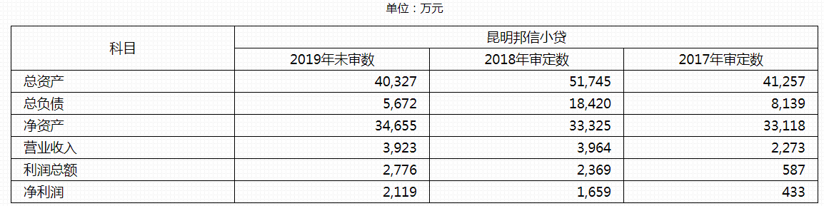 截止2019年末,昆明邦信小贷总资产为4.03亿元,净资产3.47亿元。2019年营业收入3923万元,净利润为2119万元。