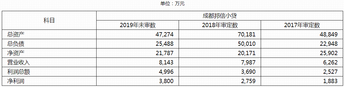 截止2019年末,成都邦信小贷总资产为4.73亿元,净资产2.18亿元。2019年营业收入8143万元,净利润为3800万元。