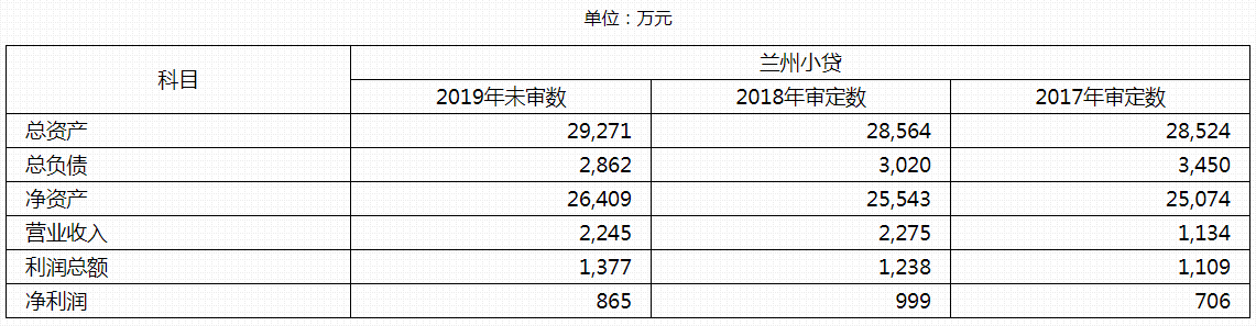 截止2019年末,兰州邦信小贷总资产为2.93亿元,净资产2.64亿元。2019年营业收入2245万元,净利润为865万元。