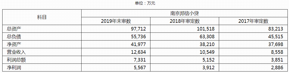 截止2019年末,南京邦信小贷总资产为9.77亿元,净资产4.20亿元。2019年营业收入1.26亿元,净利润为5567万元。