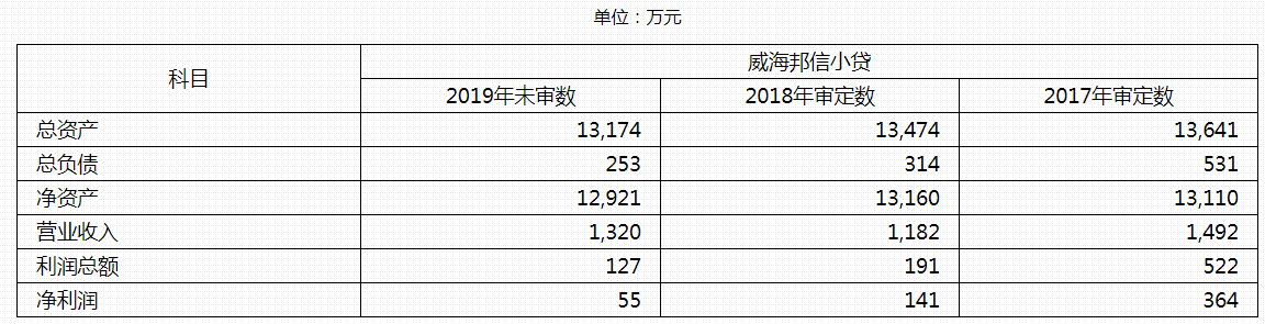截止2019年末,威海邦信小贷总资产为1.32亿元,净资产1.29亿元。2019年营业收入1320万元,净利润为55万元。