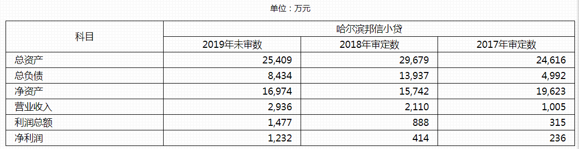 截止2019年末,哈尔滨邦信小贷总资产为2.54亿元,净资产1.70亿元。2019年营业收入2936万元,净利润为1232万元。