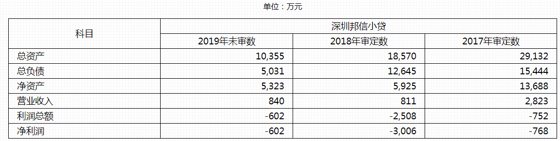 截止2019年末,深圳邦信小贷总资产为1.04亿元,净资产5323万元。2019年营业收入840万元,净利润为亏损602万元。