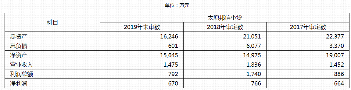截止2019年末,太原邦信小贷总资产为1.62亿元,净资产1.56亿元。2019年营业收入1475万元,净利润为670万元。
