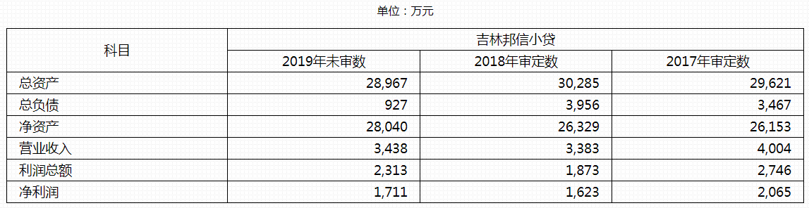 截止2019年末,吉林邦信小贷总资产为2.90亿元,净资产2.80亿元。2019年营业收入3438万元,净利润为1711万元。