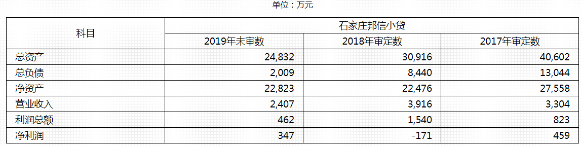 截止2019年末,石家庄邦信小贷总资产为2.48亿元,净资产2.28亿元。2019年营业收入2407万元,净利润为347万元。