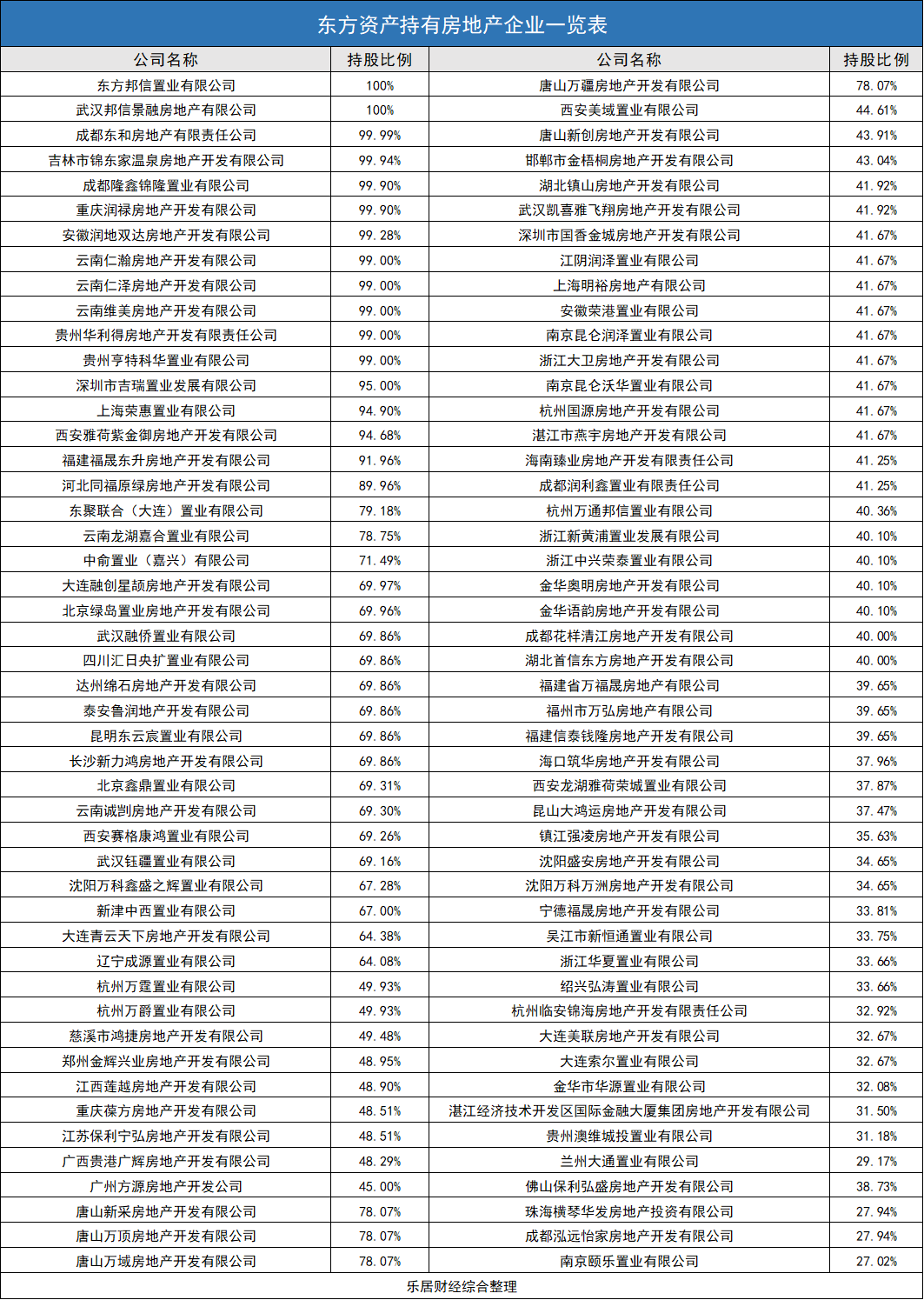 在其超过1000家的间接对外投资公司中,包含“房地产”“置业”字眼的公司,就有96家,其中有一半公司由东方资产持股50%以上。