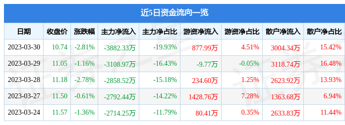 3月30日的资金流向数据方面,主力资金净流出3882.33万元,占总成交额19.93%,游资资金净流入877.99万元,占总成交额4.51%,散户资金净流入3004.34万元,占总成交额15.42%。