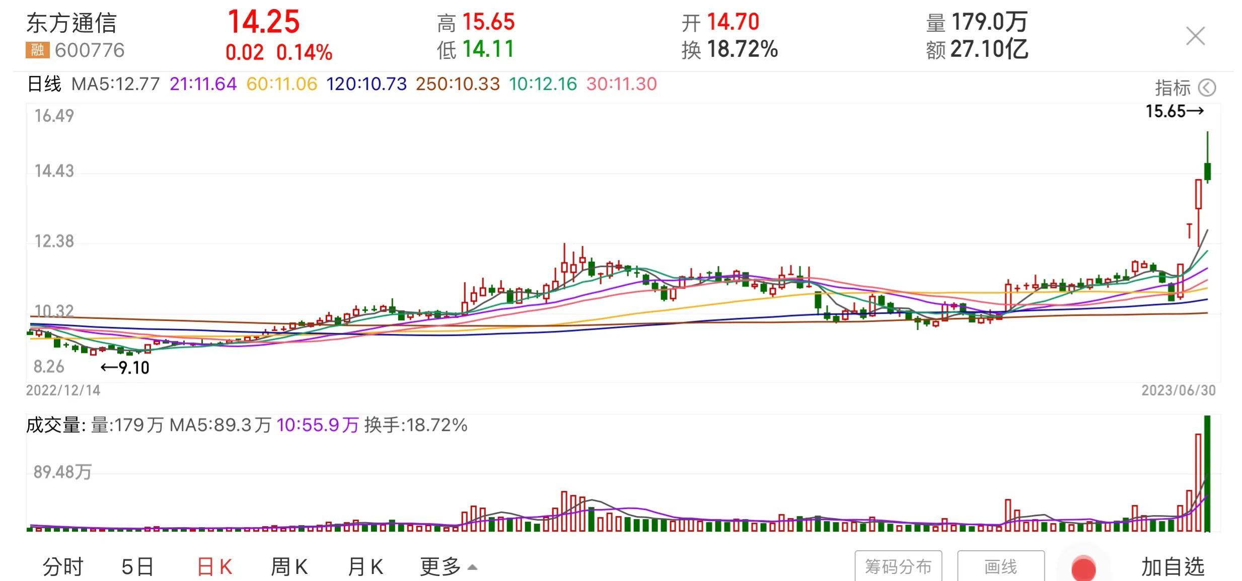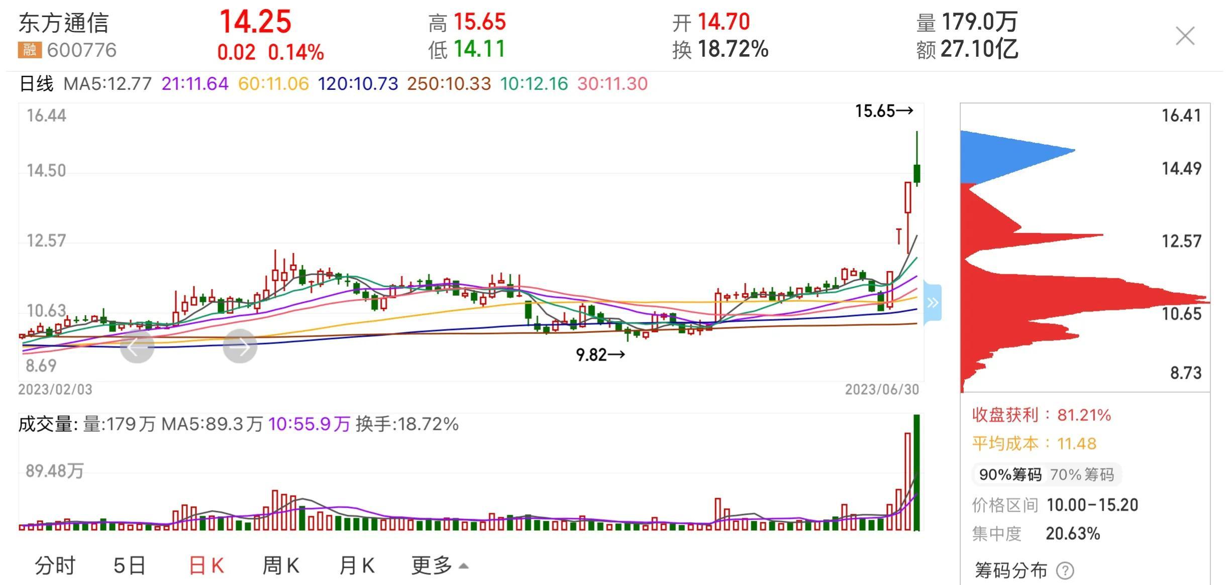东方通信最新股价为14.25元,平均成本为11.60,90%股民成本价在10.25-15.20,有78.91%的人收盘是盈利的。