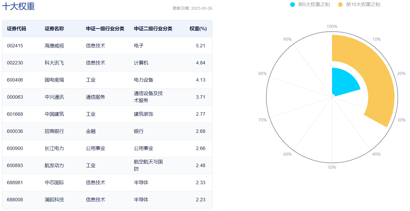 截至2023年5月26日,该指数的前十大权重股包括海康威视、科大讯飞、国电南瑞、中兴通讯、中国建筑等,前十大权重之和为33.03%。(数据来源:中证指数公司,指数成份股不代表个股推荐)