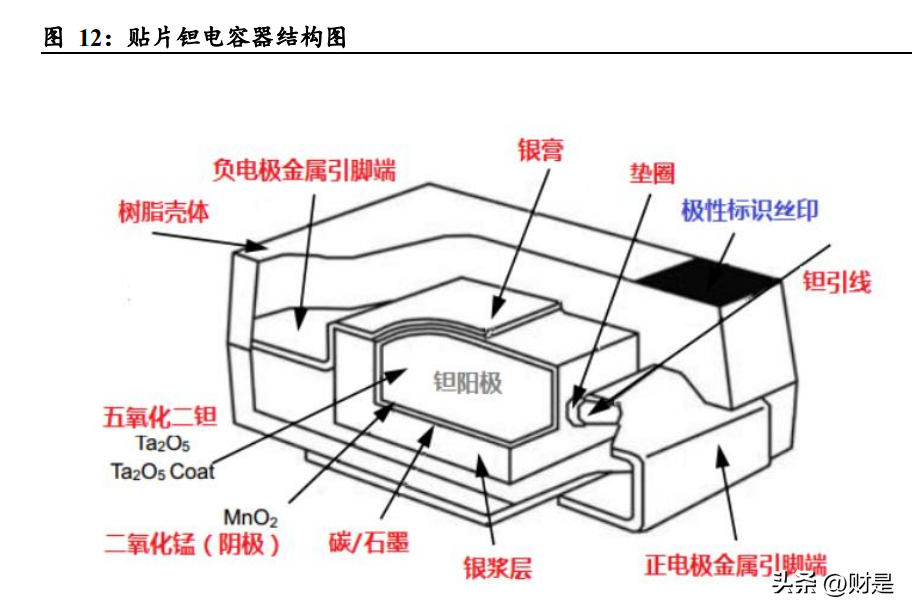 电容器是重要的电子元件之一,在电子元器件产业中占据举足轻重的地位。电容器 产量约占整个电子元件的 40%,与电阻、电感并称为三大被动元器件。电容器广泛 应用于电路中的隔直通交、耦合、旁路、滤波、调谐回路、能量转换、控制等方面, 依照不同材质其类型可以分为钽电容器、铝电容器、陶瓷电容器和薄膜电容器。钽 电容器性质卓越,具有高容量、低损耗、耐温差、长寿命等特点。 钽电容器性能优良,体系小、容量大,外形多样,可以制成适用于表面贴装的小型 和片型原件,能够匹配电子器件装配自动化、小型化的发展趋势。目前,钽电容广 泛应用于军事通讯和航天等军事领域,寿命长、耐高温、精准度高。