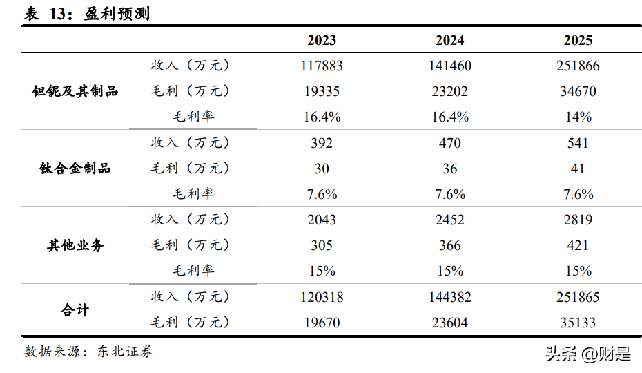 公司发展战略明确,专攻钽铌铍稀有金属新材料领域。公司专注稀有金属钽、铌、 铍及合金等的研发、生产、销售和进出口业务,在行业内品牌优势明显。2018 年, 公司通过资产置换改善产品结构,置出全部能源材料、碳化硅业务,大幅降低钛及 钛合金制品业务,置入我国唯一的铍材研究加工基地西材院,提升铍及铍合金研发、 生产能力。通过调整,钛合金业务在 2019 年扭亏为盈,但至今仍维持在较低的体 量。2022 年,公司钽铌及其合金制品实现营收 96625.65 万元,占比 97.91%,毛利 率 16.40%。