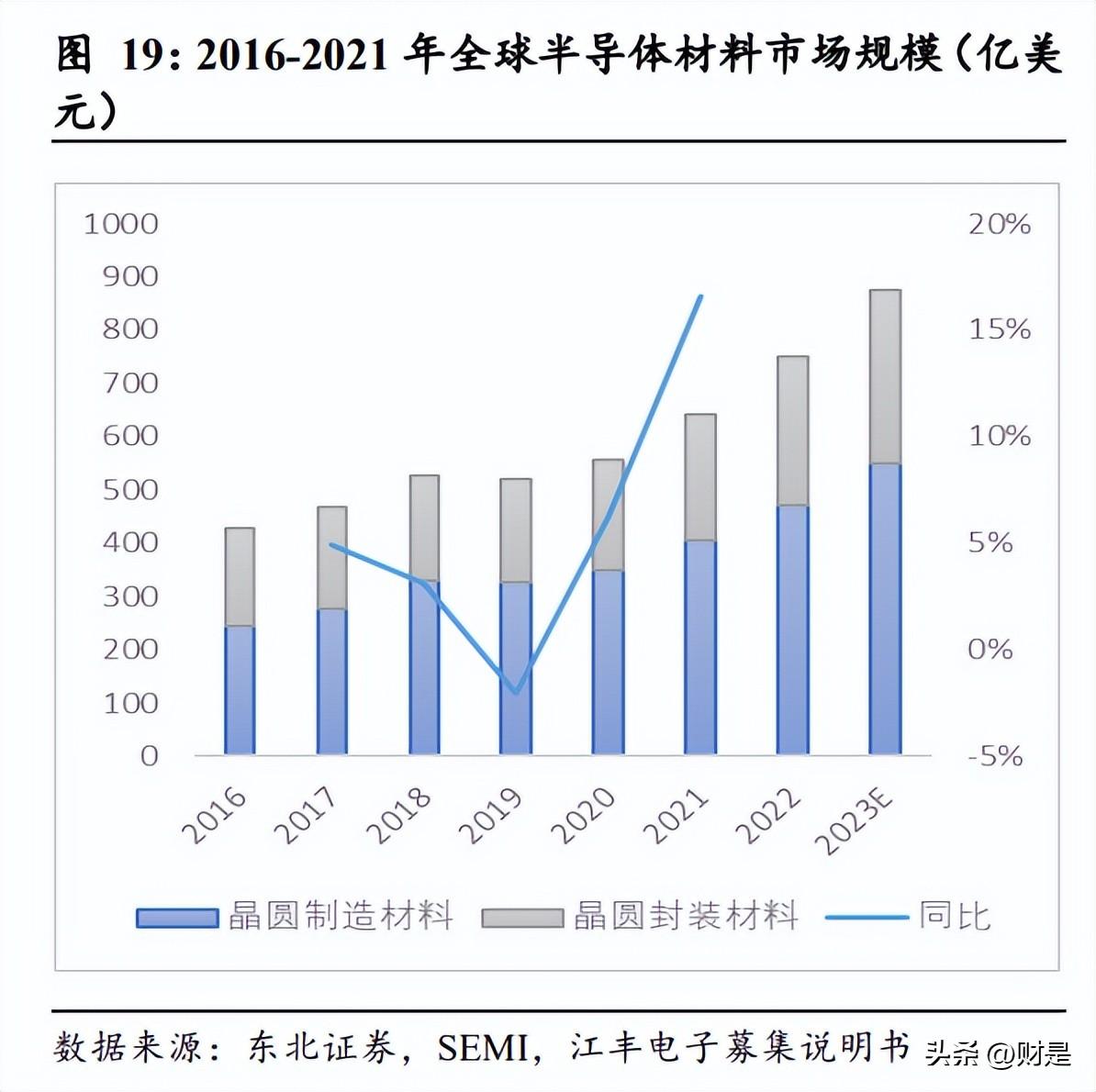 依据 SEMI 数据,全球半导体市场规模快速增长。2016 年全球半导体材料销售额为 428 亿美元,2021 年达到 643 亿美元,2016-2021 年的年均复合增长率为 8.48%。 依据中国半导体协会数据,2015 年我国集成电路产业规模为 3610 亿元,占全球市 场份额 21.11%;2021 年产业规模跃升至 8848 亿元,占全球市场规模 35.5%,远超 全球市场增速。 半导体是制作集成电路的核心材料之一,其在晶圆制造与芯片封装的成本占比相对 固定,因此高纯溅射靶材的市场规模预计将随半导体同步增长。 在晶圆制造环节,高纯溅射靶材通常被用作晶圆导电层、阻挡层以及金属栅极的溅 镀,目前全球量产晶圆尺寸包括 6 英寸、8 英寸、12 英寸等不同规格,其中 12 英 寸应用最为广泛。依据 SEMI 统计,在晶圆制造材料中,溅射靶材约占芯片制造材 料市场的 2.6%,其市场规模将由 2016 年 6.4 亿美元,增长至 2021 年 10.5 亿美元。 随着国家政策的扶持、科技水平的发展和新能源汽车、工业智造、新一代移动通讯 等终端应用市场的扩大,预计未来中国大陆晶圆代工市场的规模将保持较高的增速。 在芯片封装环节,高纯溅射靶材被用作贴片焊线的镀膜。依据 SEMI 统计,在封装 测试材料中,溅射靶材约占封装测试材料市场的 2.7%,其市场规模由 2016 年 4.91 亿美元,增长至 2021 年 6.45 亿美元。